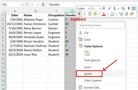 how to delete a column in excel with keyboard