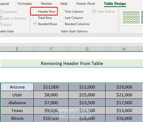 how to remove column headers in excel table