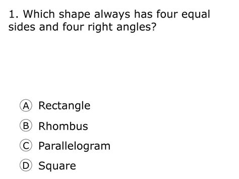 which shape always has four equal sides responses. There are any references about which shape always has four equal sides responses in here. you can look below.